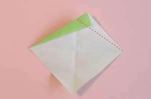 頂点(緑の丸)が先程の折り線上にくるように折ってくださいね。